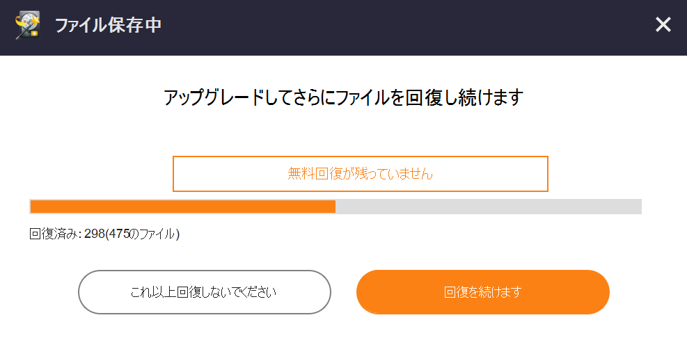 「これ以上回復しないでください」を選択した場合、今まで復元したデータのみの保存となり、「回復を続ける」を選択した場合は有料プランへが表示されます。