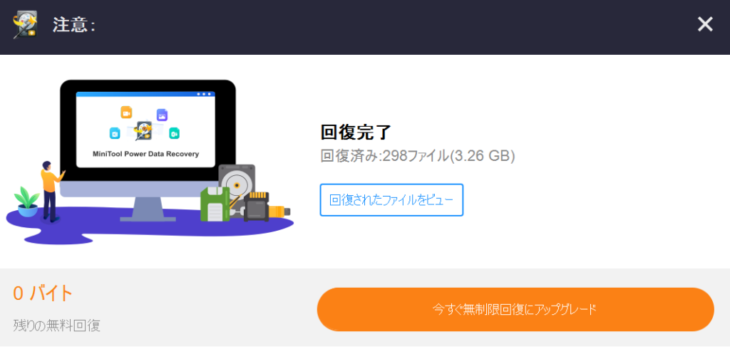 さらに復元容量がなくなってしまった場合は回復完了画面からも有料プランにアップグレードの案内が入るため、無料で使いたい場合はこの点も注意が必要となります。
