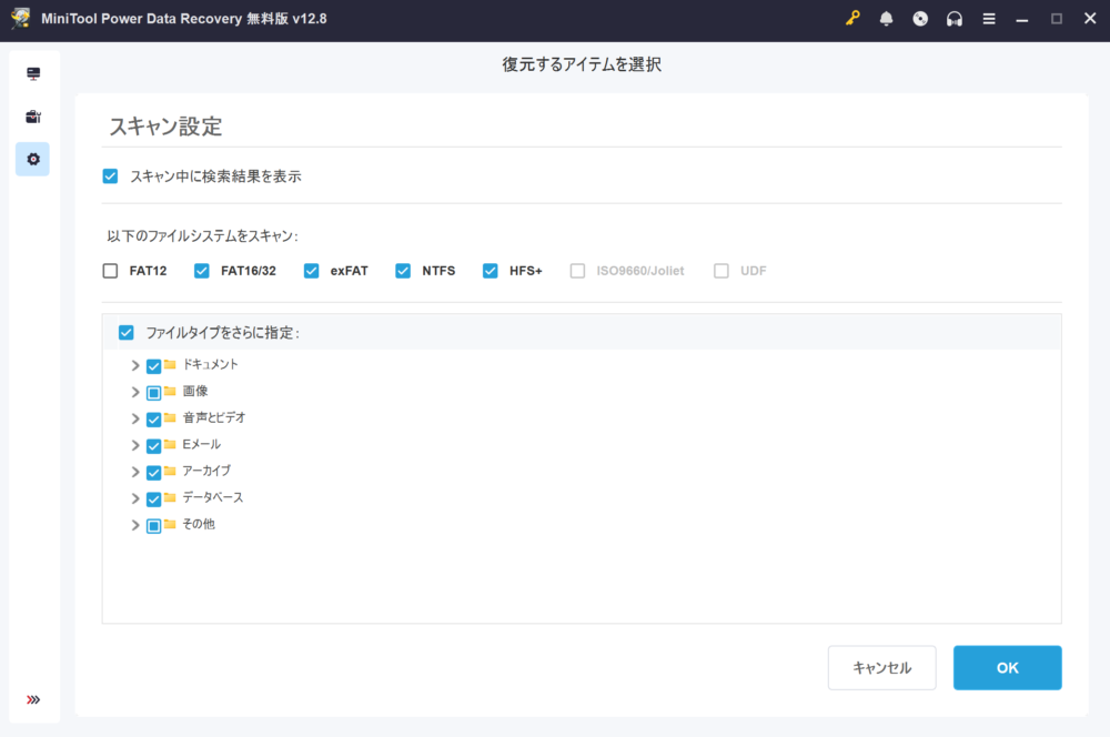 MiniTool Power Data Recoveryではどんなファイルシステムをスキャンするか事前に指定することができます。