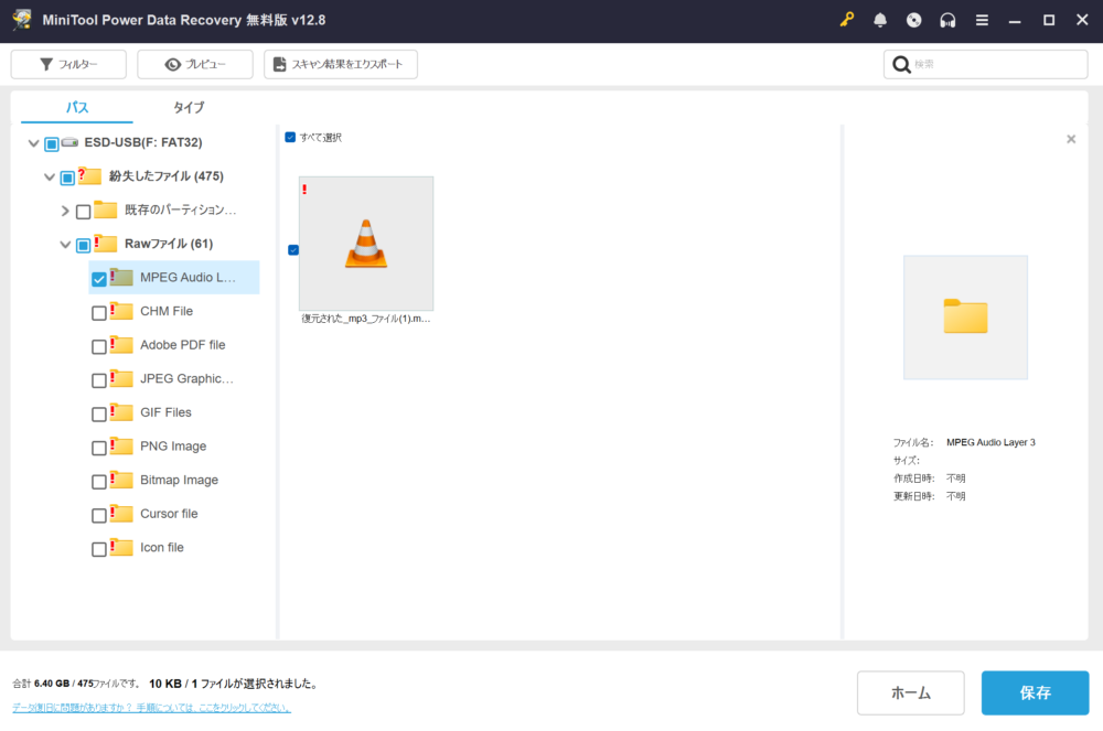 復元したいファイルは任意のフォルダに保存することができ、保存場所を選択することで復元が開始され保存されます。