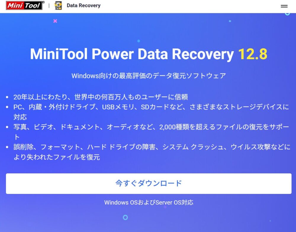 MiniTool Power Data Recovery(ミニツール・パワー・データ・リカバリー)は、誤って削除してしまったファイルや、フォーマット後に失われたデータを復元できるWindows向けのデータ復旧ソフトです。