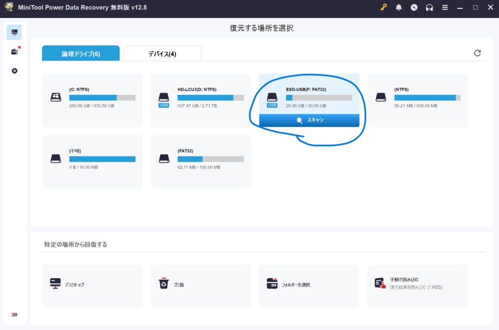 └※今回は外部USBメモリで行っています。外部メモリはパソコンに外部メモリを挿すことで認識し、MiniTool Power Data Recovery上で自動的に表示されます。