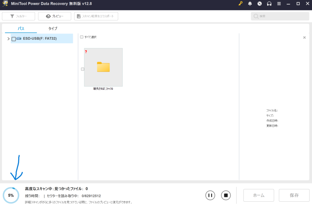 上記のように1GBの保存容量を超えると今まで復元したデータのみを保存する(これ以上回復しないでください)か更に保存を続ける(回復を続ける)かの選択肢が表示されます。